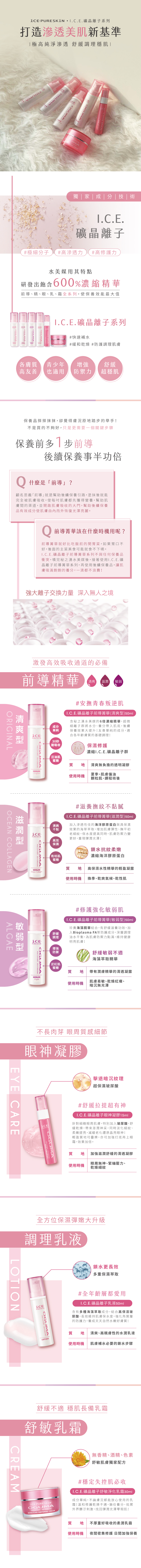 保養流程:水美媒→I.C.E. 礦晶離子前導菁華(清爽、敏弱、滋潤)→I.C.E. 礦晶離子眼神凝膠→I.C.E. 礦晶離子乳液→I.C.E. 礦晶離子舒敏淨化乳霜
