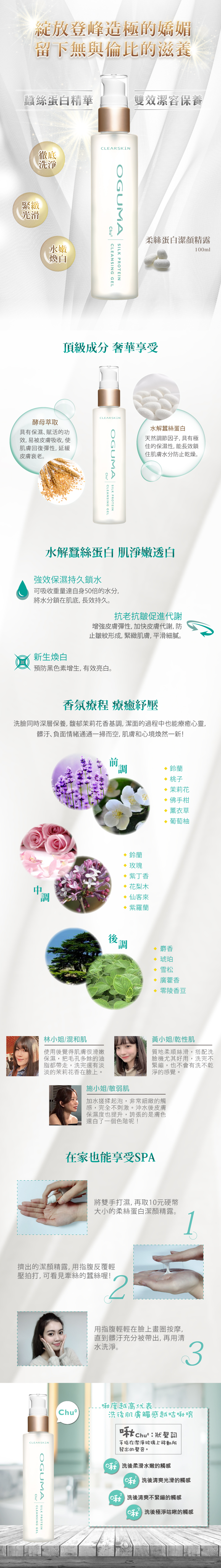 OGUMA專業研發團隊嘔心瀝血打造「柔絲蛋白潔顏精露」,使用天然頂級蠶絲蛋白,分子大小為膠原蛋白的1/20輕盈的柔絲膠狀質地接觸肌膚後,自動轉化為絲滑清新的保養液,溫柔推勻於肌膚,輕鬆溶出髒汙、殘妝。讓肌膚享受最奢侈的沐浴。清新茉莉花香調,兼具洗臉和保養功能,讓肌膚和心靈踏上一趟奢侈的紓壓療癒之旅吧!