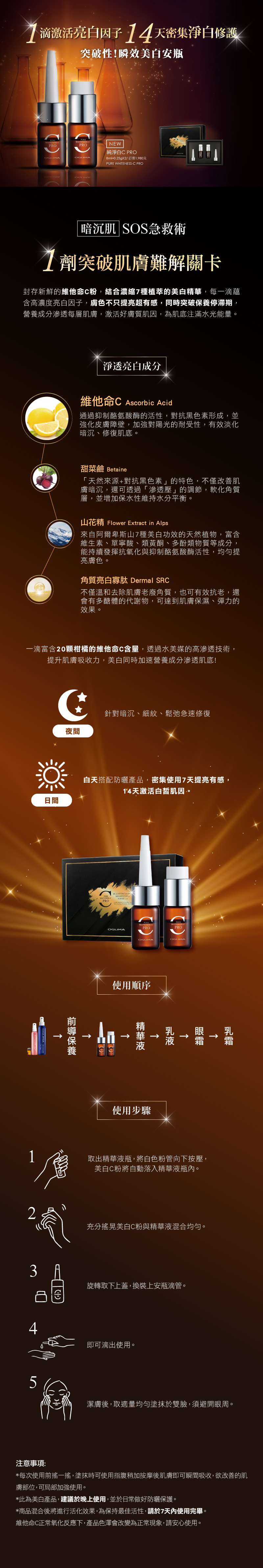 4. 商品混合後將進行活化效果,安瓶將在七天內達到最佳效果,由於維他命C正常氧化反應下,產品色澤會改變為正常現象。