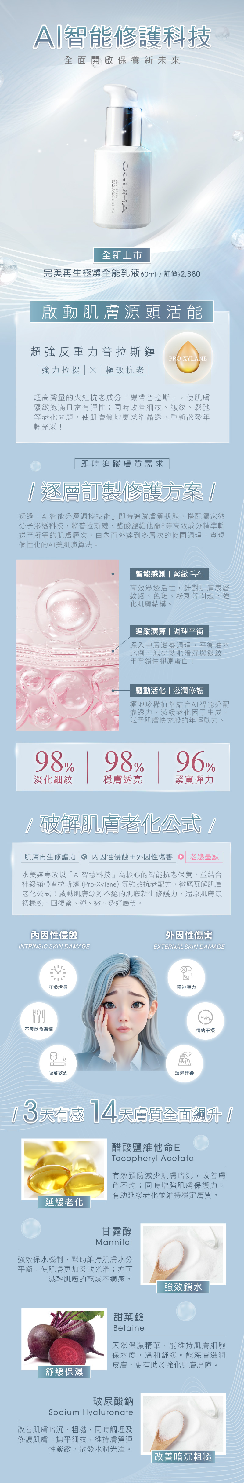 「 AI 智能 膚況 感測」 加上 「微分子滲透科技」 ,依據不同肌膚需求 全效啟動肌膚修復機制,從 根本激發健康能量, 打造完美防盾肌底 。 3 天有感、 14 天全面升級, 打造 緊緻、彈嫩、透亮 的青春膚質!