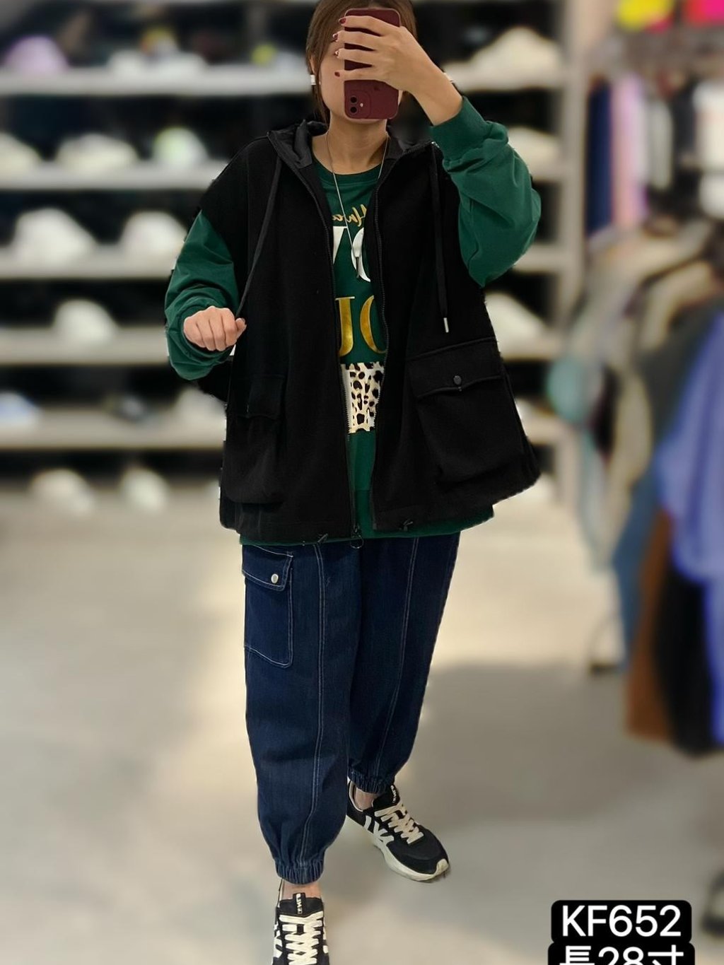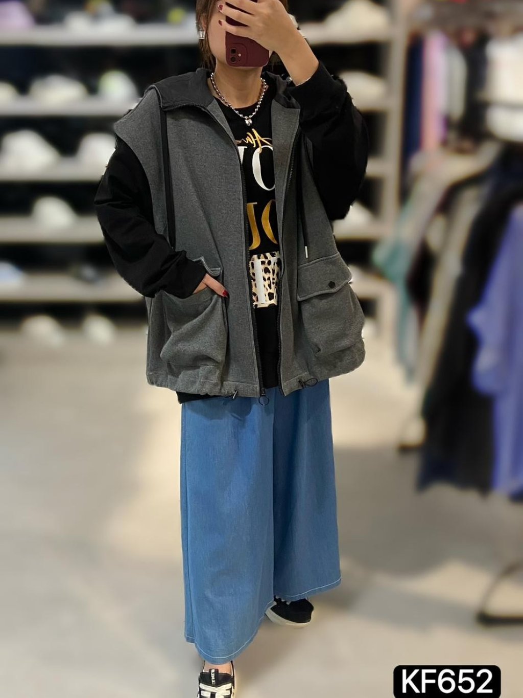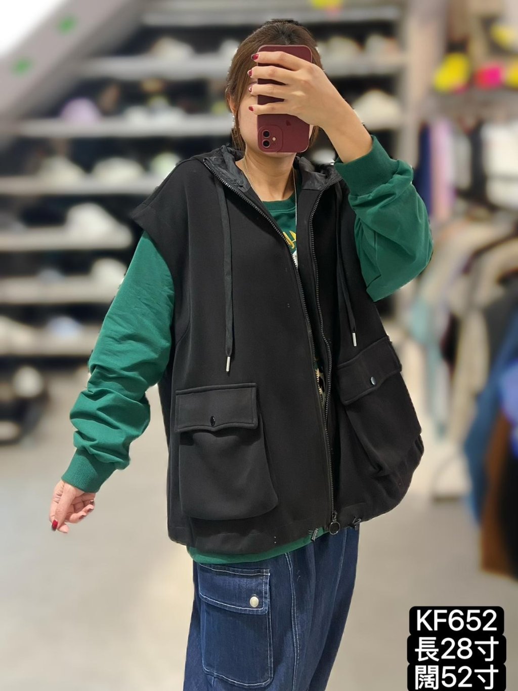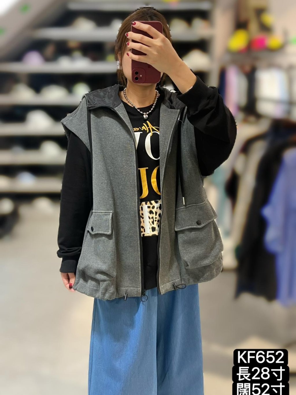 KF652 棉料雙袋有帽背心JK 長28寸、闊52寸 $199 黑、灰