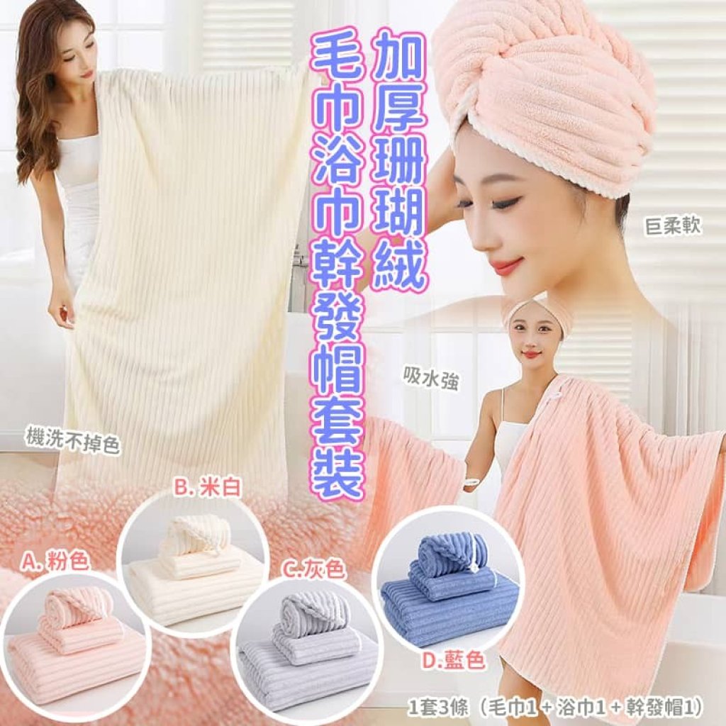 📢預訂團購---K005✨加厚珊瑚絨毛巾浴巾乾髮帽3件套裝✨(約12月中到貨)-$55