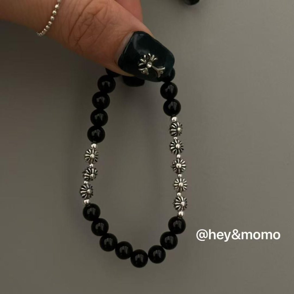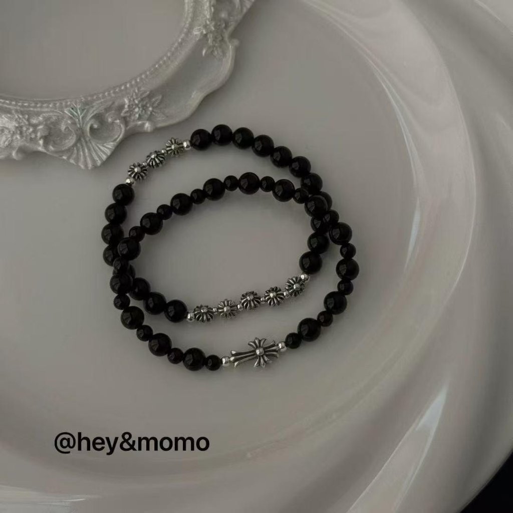 HM457 韓國 🇰🇷 925銀 李龍馥同款黑瑪瑙➕克羅心十字花 重工彈力繩手鍊 $269