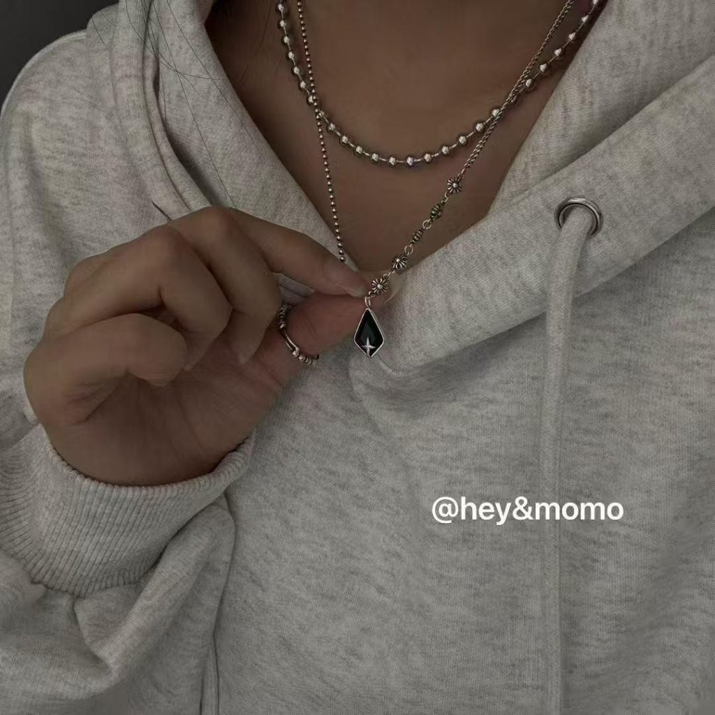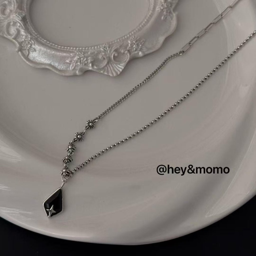 HM467 韓國 🇰🇷 925銀 黑釉四芒星菱形吊墜➕克羅心十字花拼接鏈條 項鏈 $379