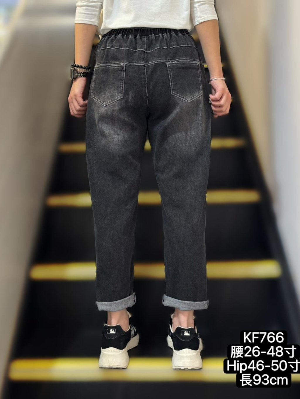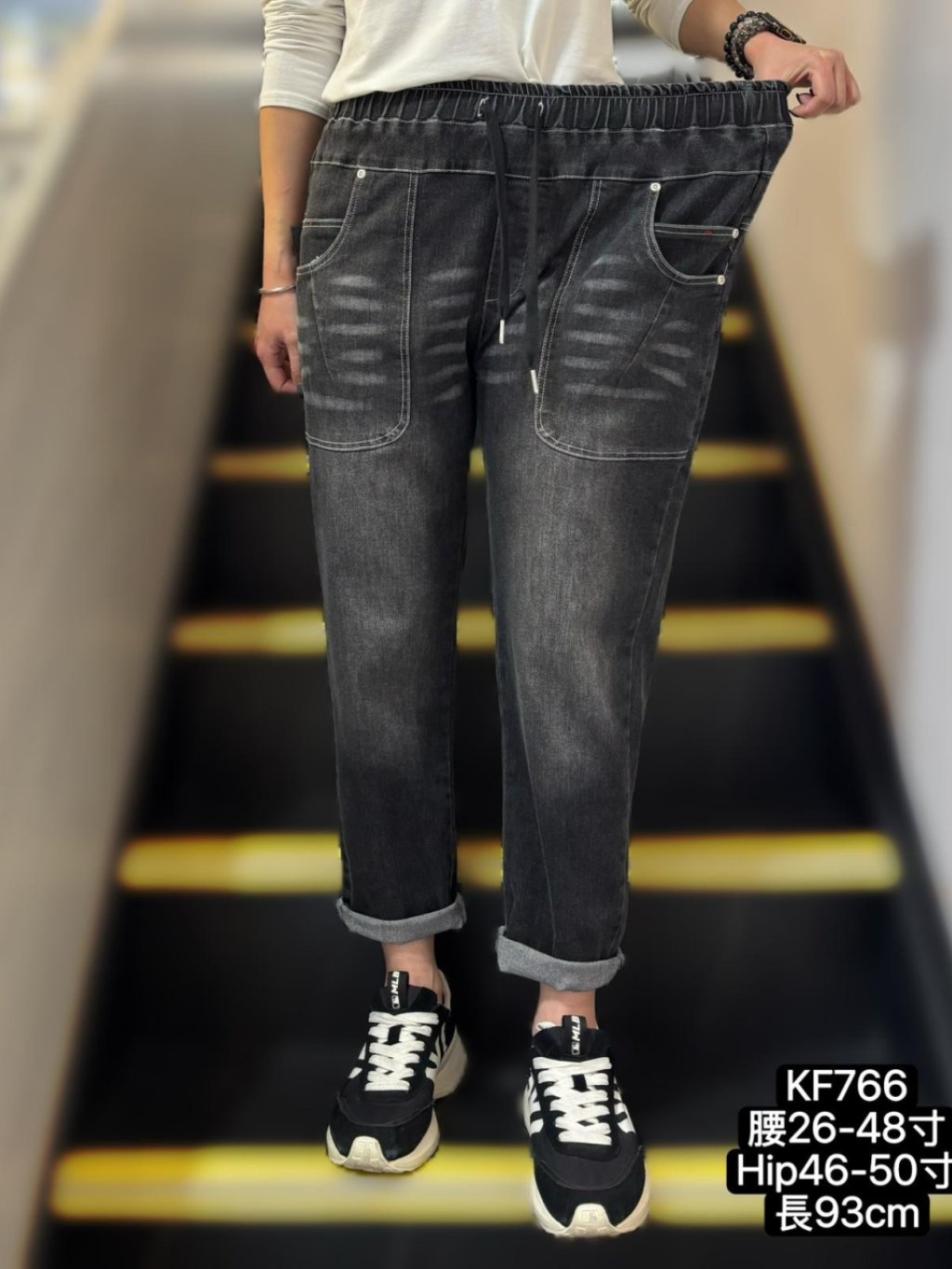 KF766 全橡筋腰洗水貓鬚牛仔褲 黑 藍 $179@1,2條或以上每條減$9 腰:26-48吋、 Hip:46-50吋、 褲長:93cm
