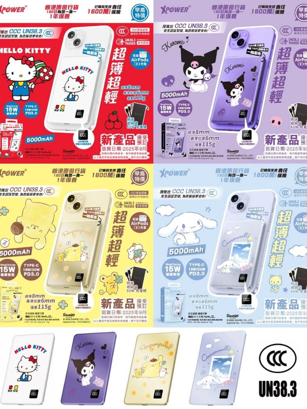 LG803 XPower x Sanrio M5K 3合1磁吸+PD3.0 5000mAh鋁合金移動電源 $249@1 白-HELLO KITTY、 紫-KUROMI、 黃-布甸狗、 藍-玉桂狗
