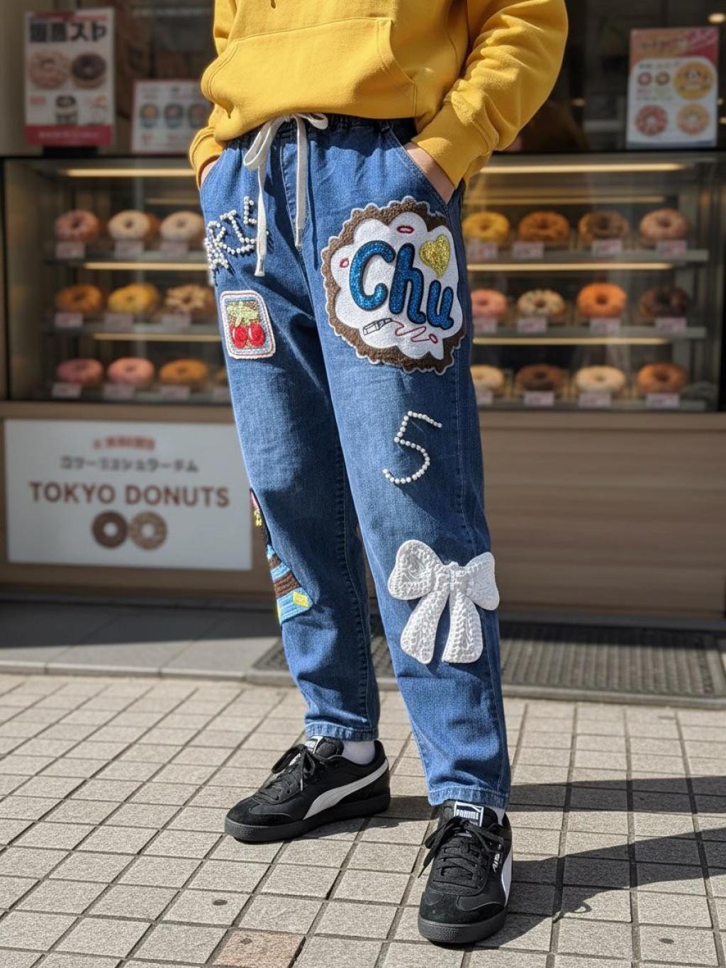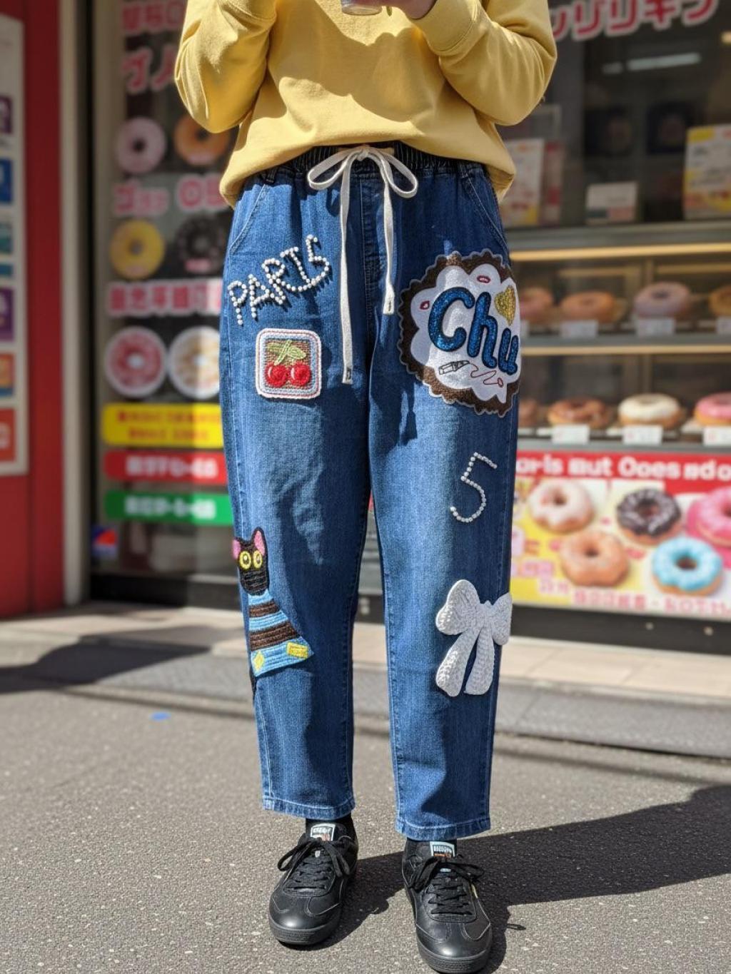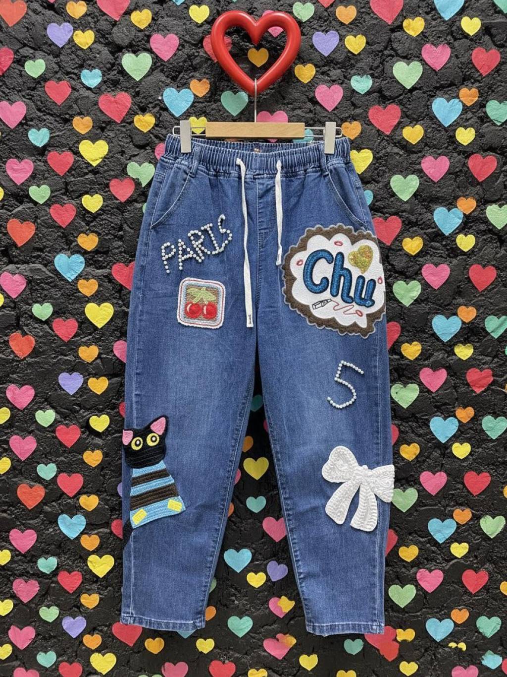KF854 PARIS釘珠拼車章牛仔褲 腰26-42寸、HIP46寸、長94cm $179