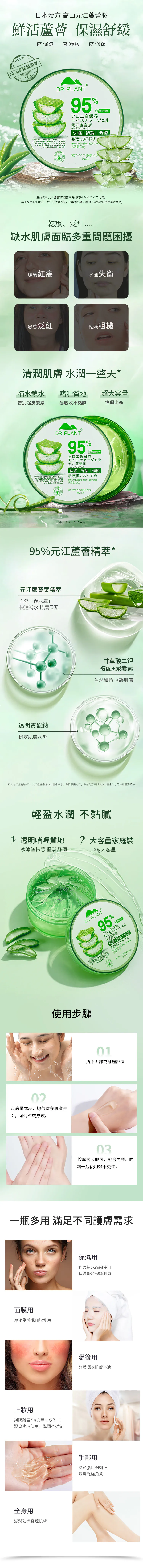 蘆薈具有殺菌、消炎、保濕功效,自古以來便視為民間良藥,甚至享有著「植物醫生」之美譽。Dr Plant 元江蘆薈Gel甄選來自海拔1600-2200米的高山元江蘆薈提取物,高濃度95% 蘆薈水,含18種微量元素、11種游離氨基酸、12種主要維生素、酚類、多醣體等,純度非常高,活性强,具有良好的修護肌膚效果、是極佳的保濕保養品!植物醫生元江蘆薈膠100% 純天然,性質極溫和,具有紓緩、鎮靜、保濕、消炎、抗菌、消腫、止痛等,用途非常廣泛
