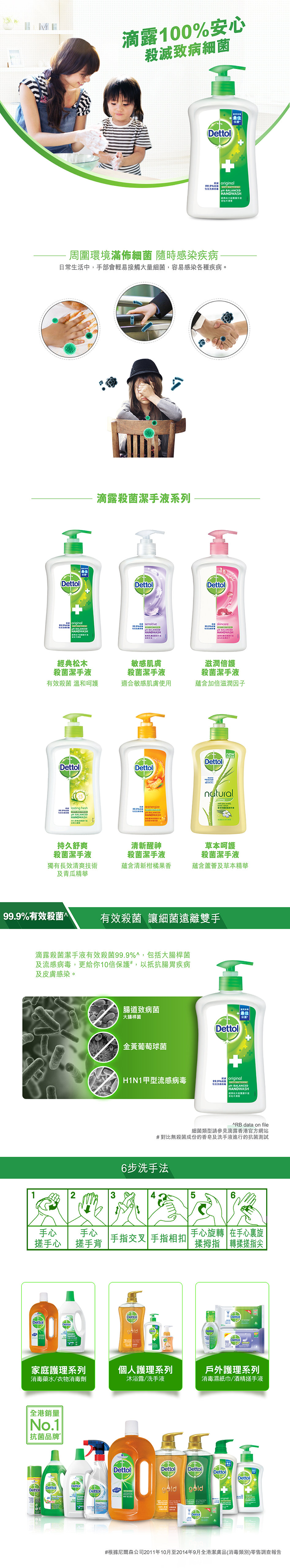 滴露殺菌潔手液有效殺菌99.9%**,包括大腸桿菌及流感病毒,更給你十倍健康保護及前所未有最佳保護*,以抵抗腸胃疾病及皮膚感染#。其pH均衡配方證實對肌膚溫和呵護,配合深受信賴的滴露防菌保護,有效潔淨雙手,每日給你健康清新的感覺。