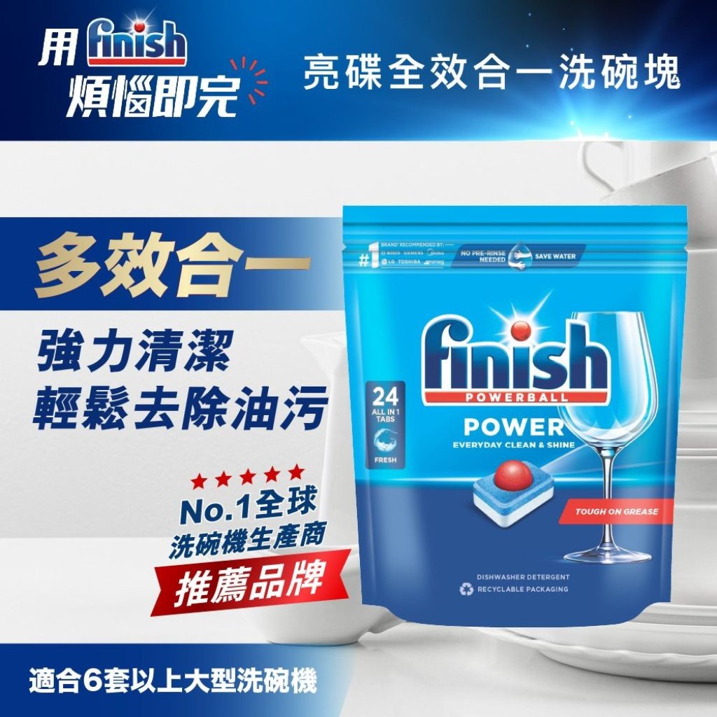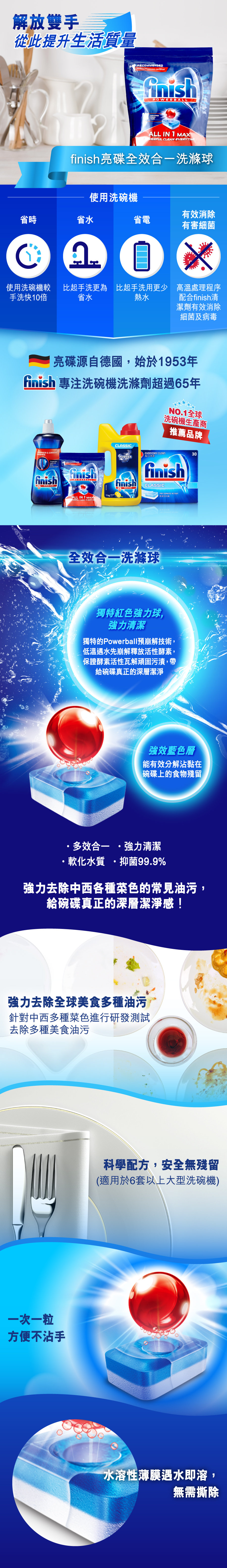 亮碟finish 全效合一洗滌球獨有的Powerball預瓦解技術,可在低溫遇水率先釋放活性酵素,強力去除中西各種菜色的常見油污,給碗碟真正的深層潔淨感!