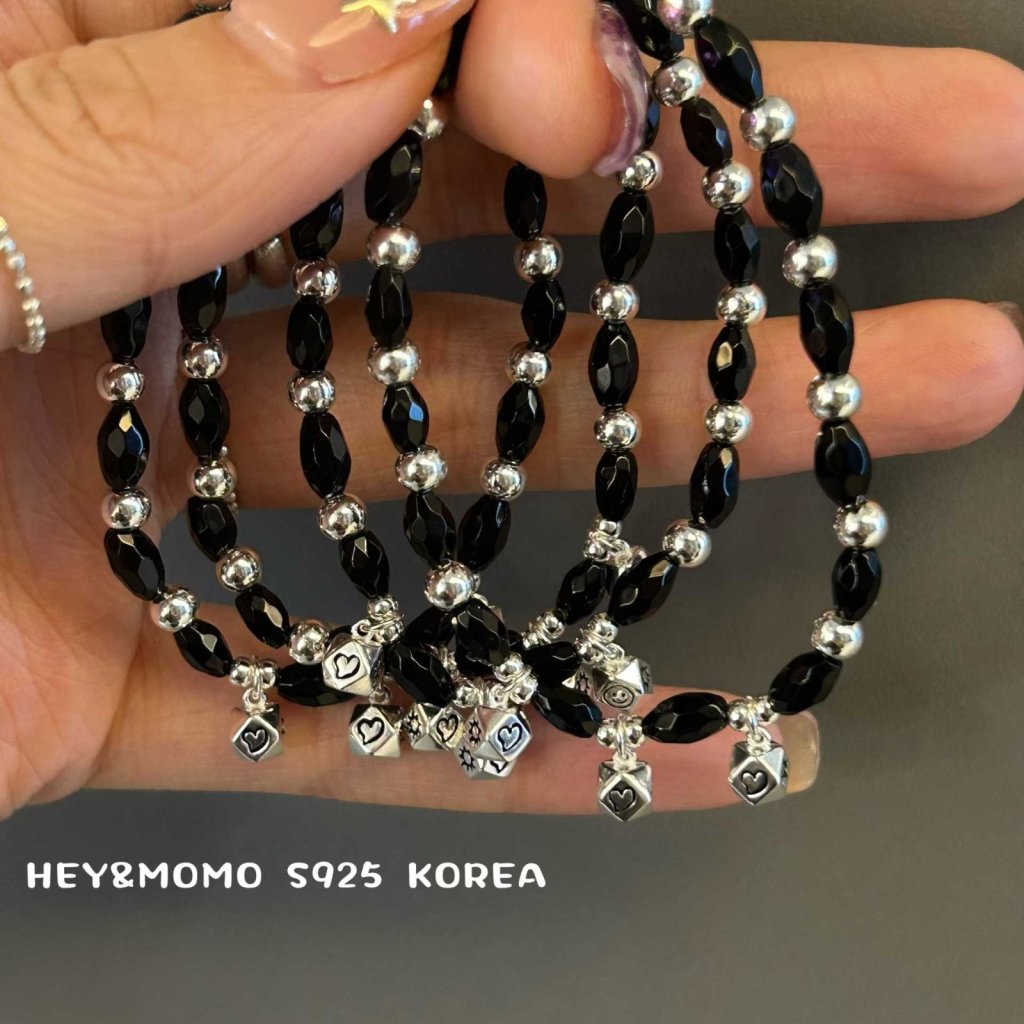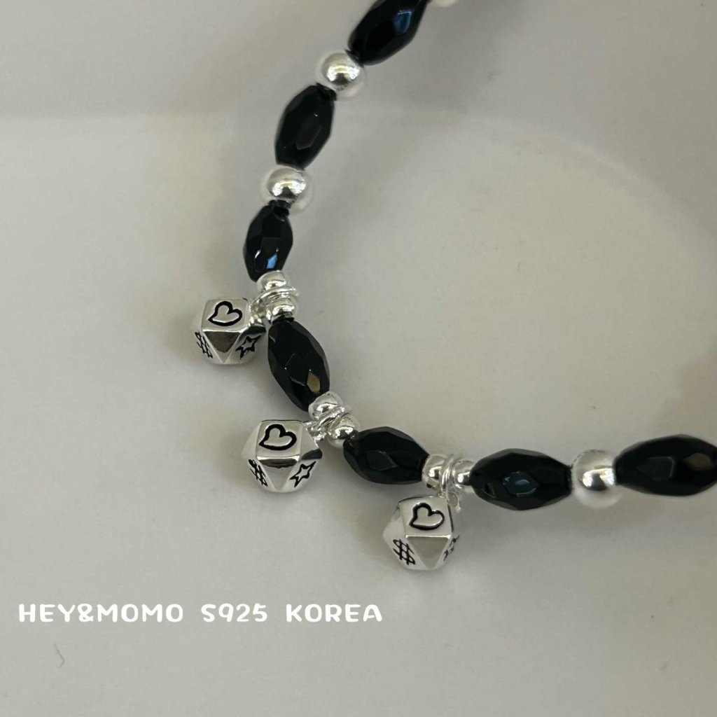 HM633 韓國 🇰🇷 925銀 切割黑晶石銀球拼接立體切割銀塊圖樣彈力繩手鍊 $239