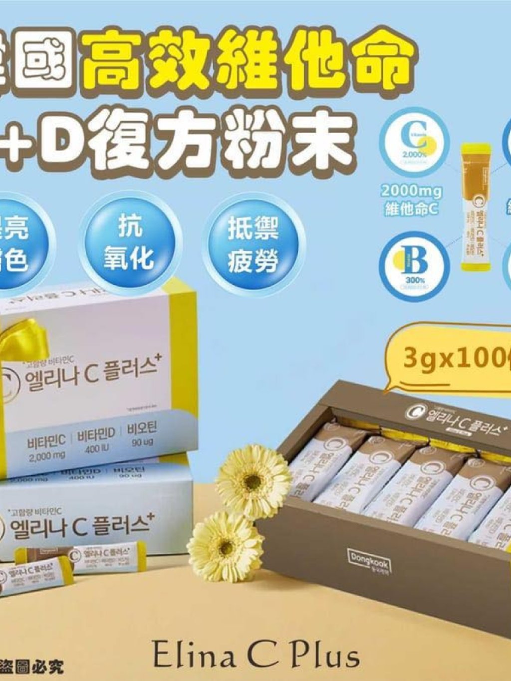 😎Elina C Plus是由韓國知名東國製藥出品嚴格依照GMP認證標準製造,讓您安心補充每日所需營養。