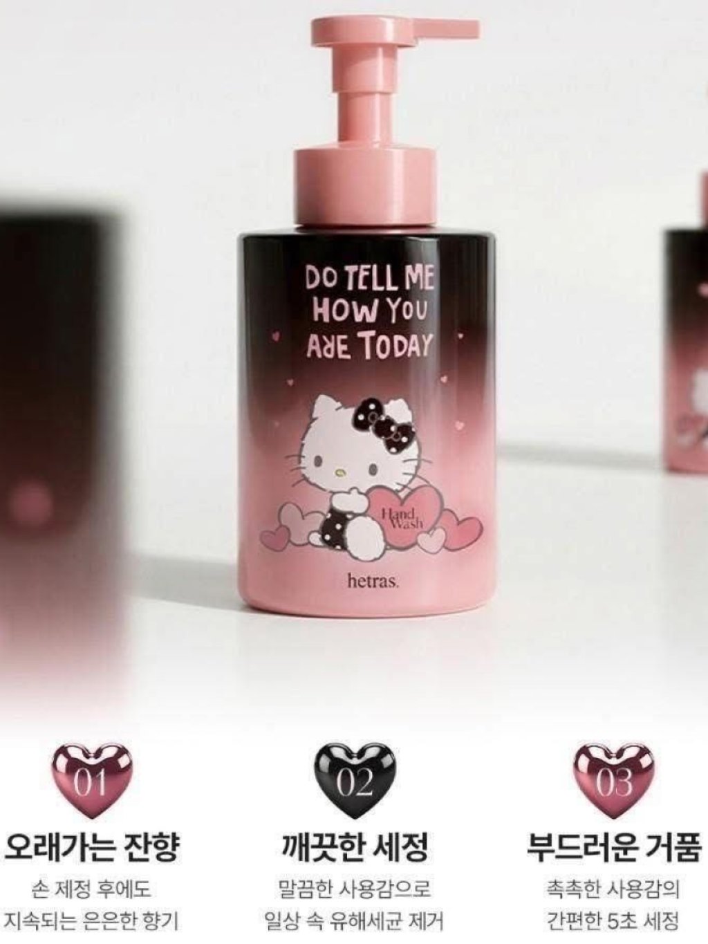 Hello Kitty合作限定發售的含有Helloberry香味的Hetras香水泡泡洗手液。