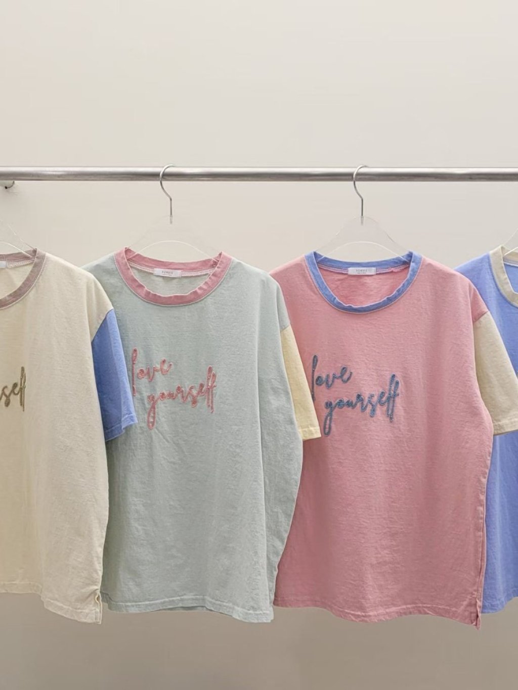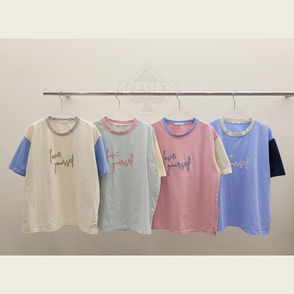 PR18 韓國 - POWDER撞色手袖繡線文字Top 長25吋、闊46吋 $149 杏、綠、粉、藍