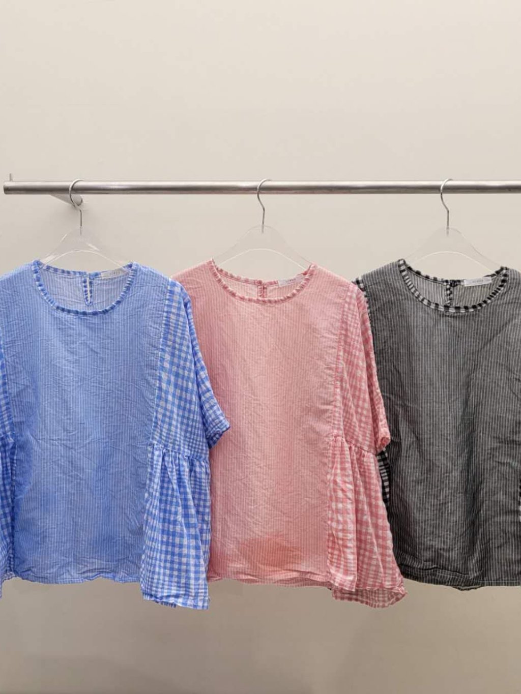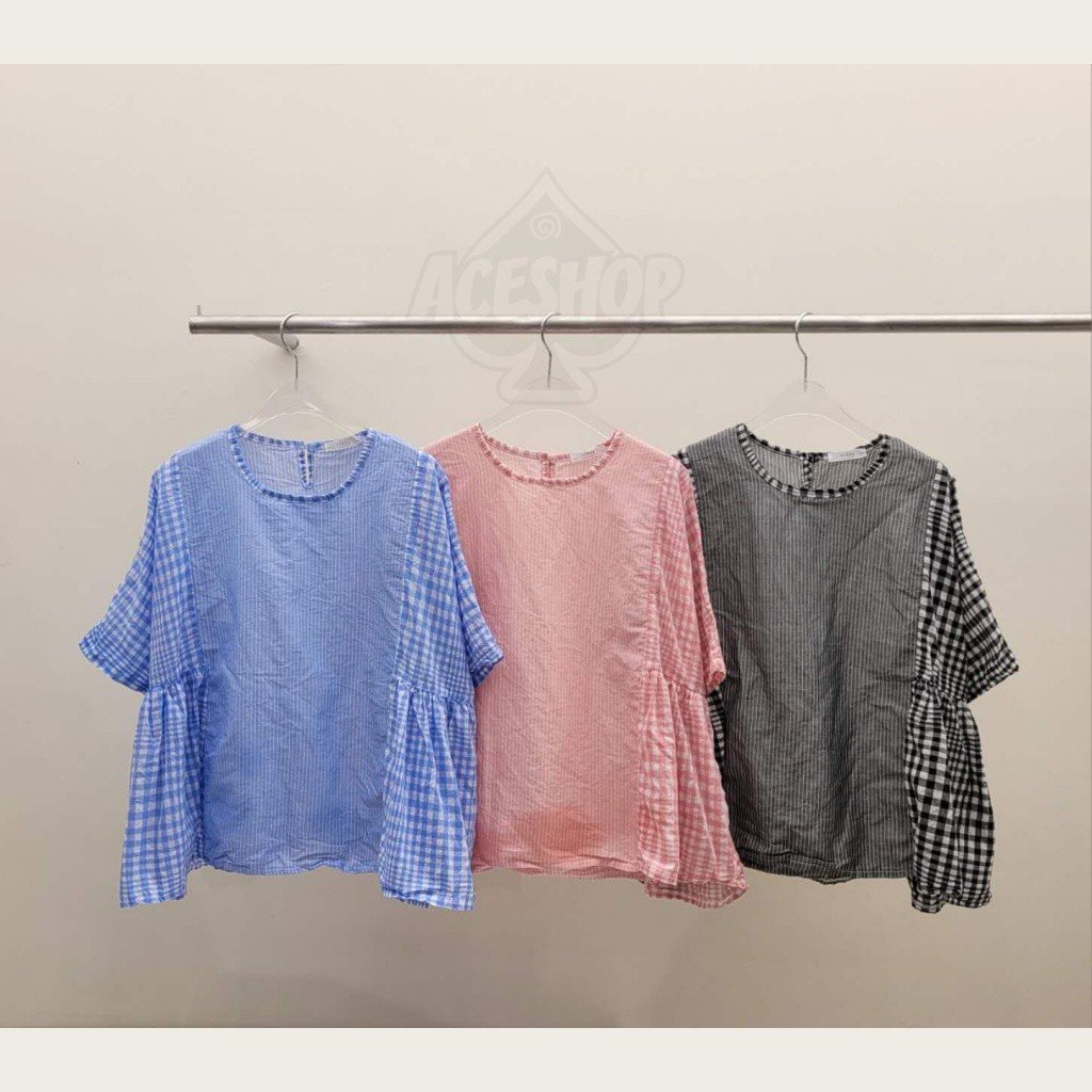 PR32 韓國 - POWDER條子拼格仔Top 長23吋、闊48吋 $219 藍、粉、黑